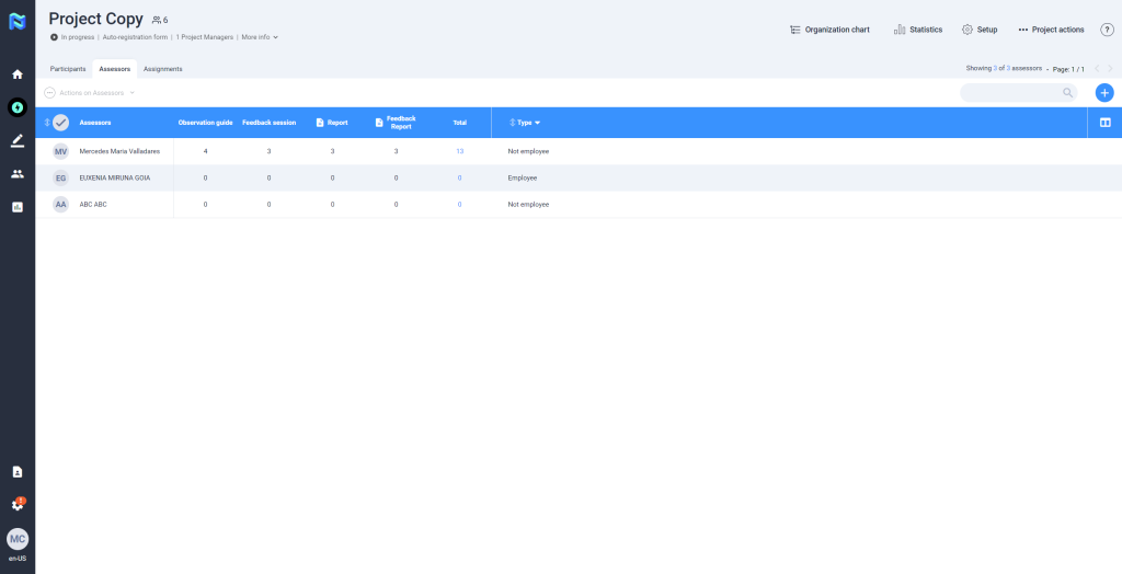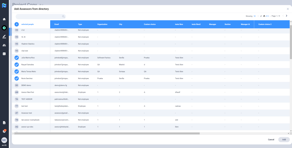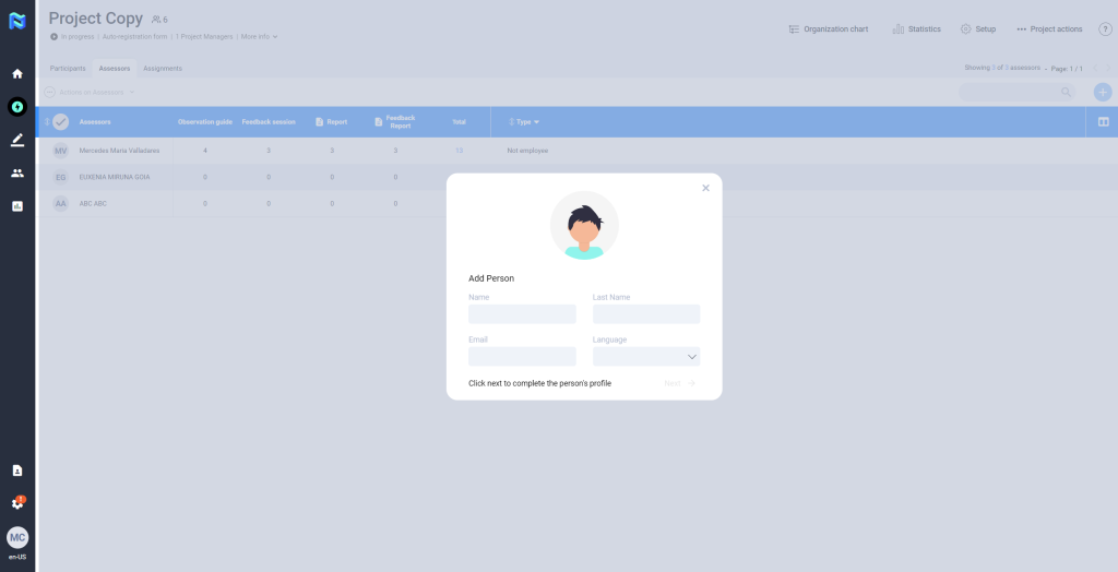 To add the Assessors to the Project, the Project Manager must be placed in the Assessors tab and click on the Add Assessor button, press the From Directory button or Create New one and add the assessors in the same way that it was done for the participants from the “From directory” option or “Create New one” Option.