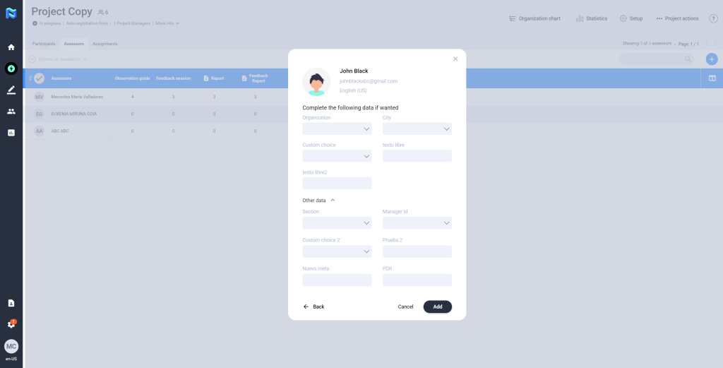 Next, fill in the fields corresponding to the metadata. Remember, when creating a participant, if the assessor you are adding has a corporate email address, some metadata may be mandatory.