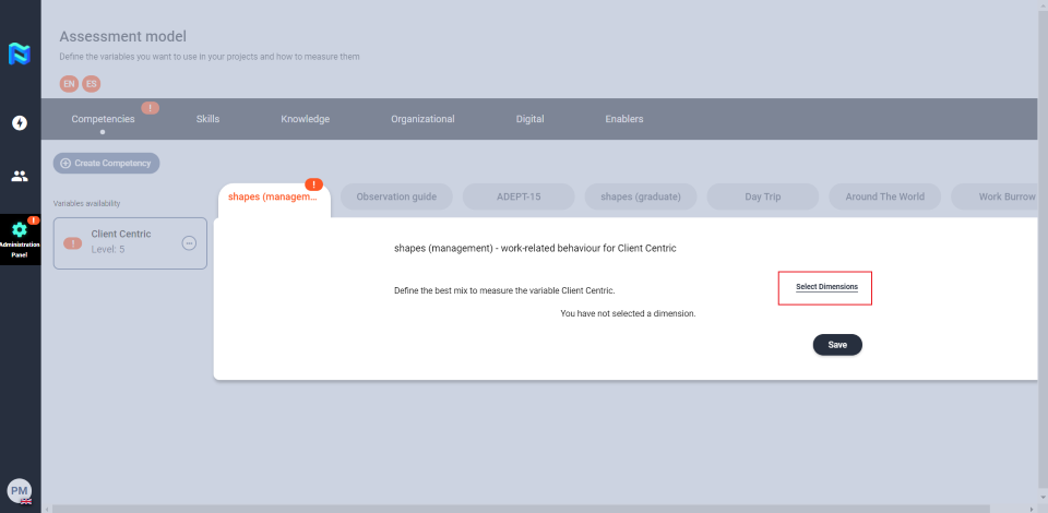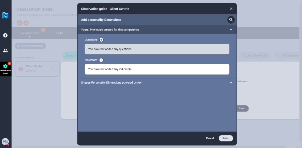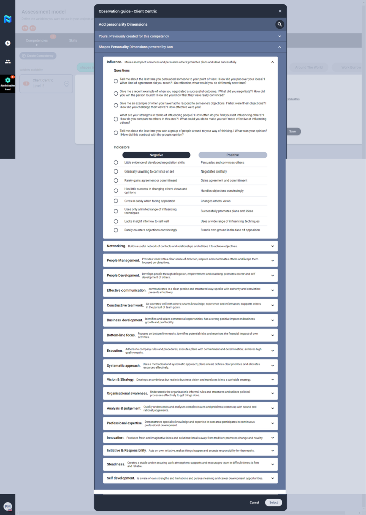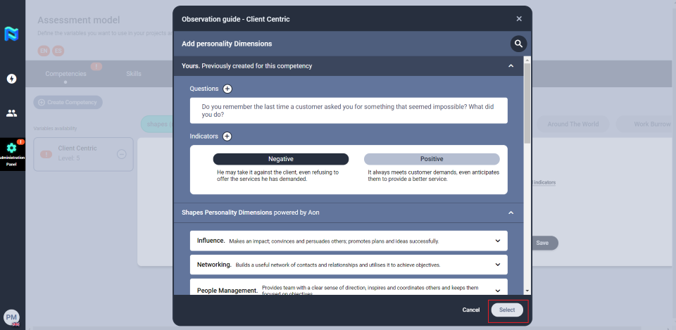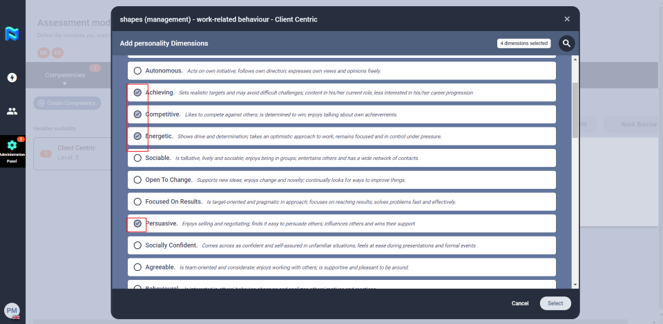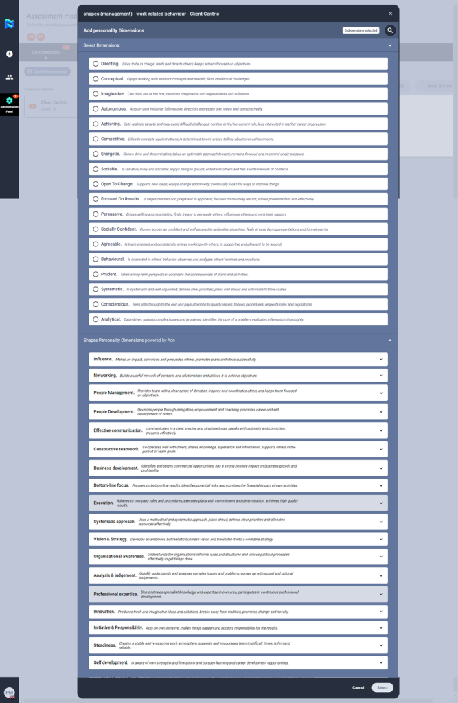 A modal will open with a drop-down box where you will see the available dimensions. You will need to select the ones you want to use to measure your competency by clicking on the circle to the left of the dimension name. Then save it using the “select” button.