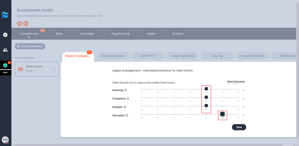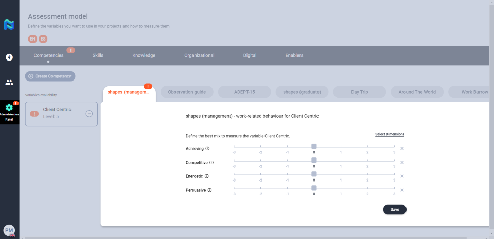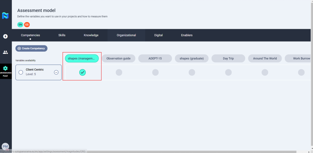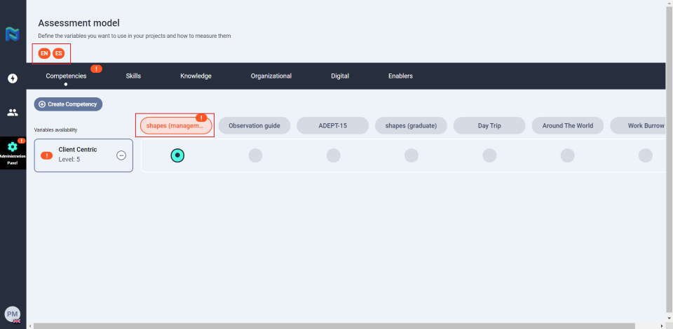 The next step will be to define which tool you are going to use to measure that competency (e. g. shapes management). To do this, click on the competency and then mark the circle corresponding to the tool with which you want to measure it. When you do this, you will see that the tool will automatically be marked orange and an exclamation mark will appear on it, this means that the tool needs to be configured for the selected variables. Then, click on the tool to configure it.