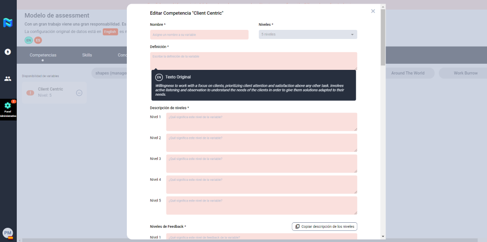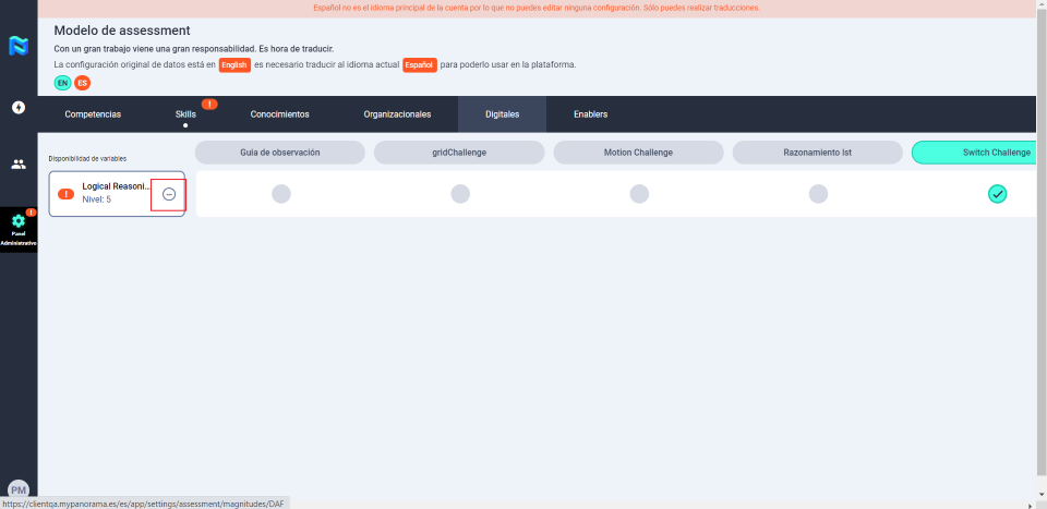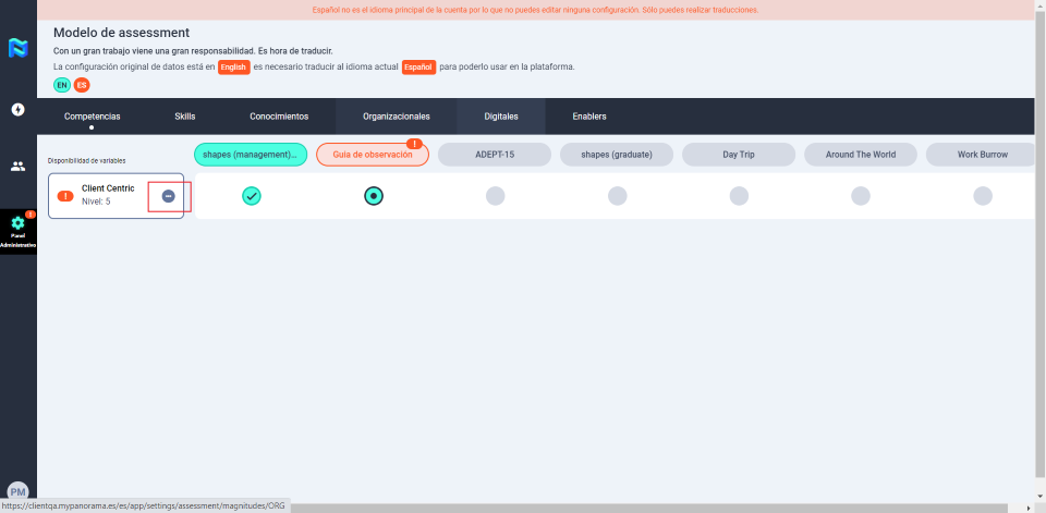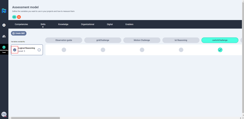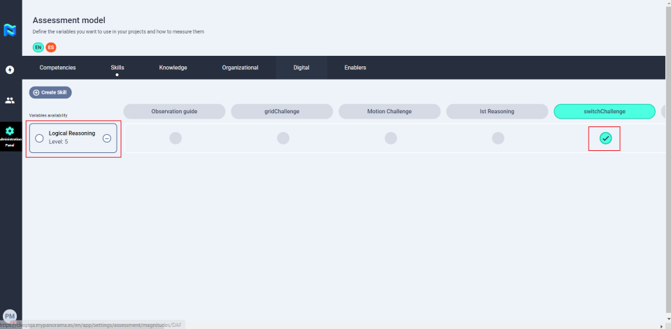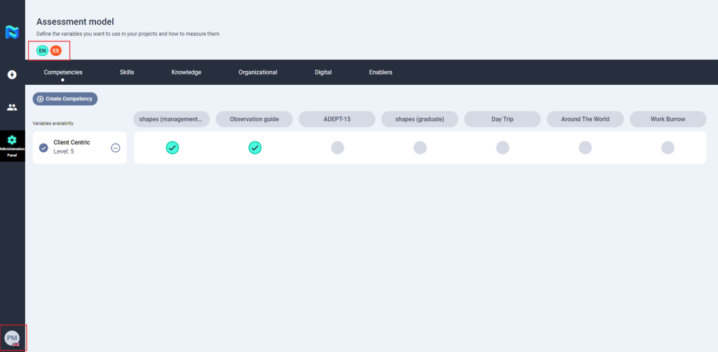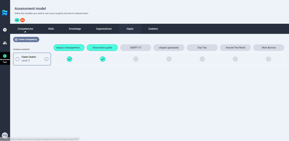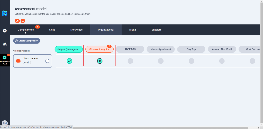 To do this, click on the competency and then mark the circle corresponding to the tool with which you want to measure it. When you do this, you will see that the tool will automatically be marked orange and an exclamation mark will appear on it, this means that the tool needs to be configured for the selected variables. Then, click on the tool to configure it.