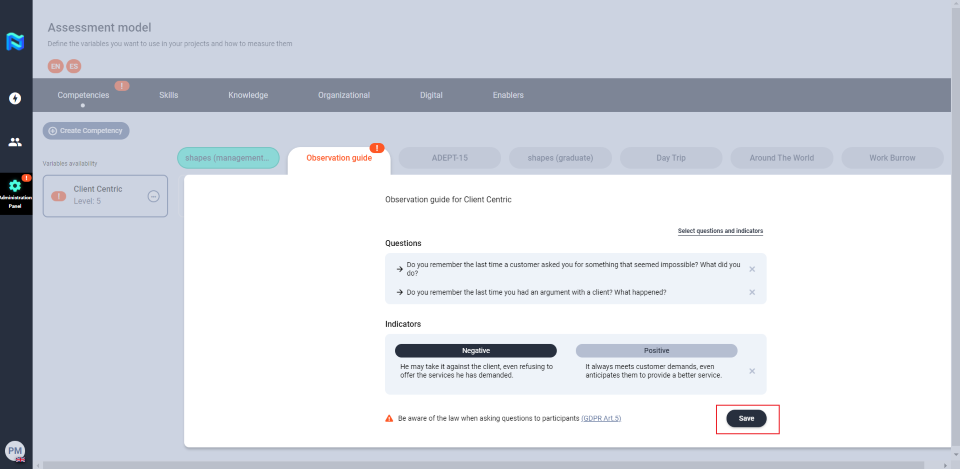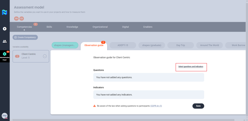 You can create your own questions and indicators or you can use the questions and indicators that are preloaded on the platform that corresponds to the shapes competency model.