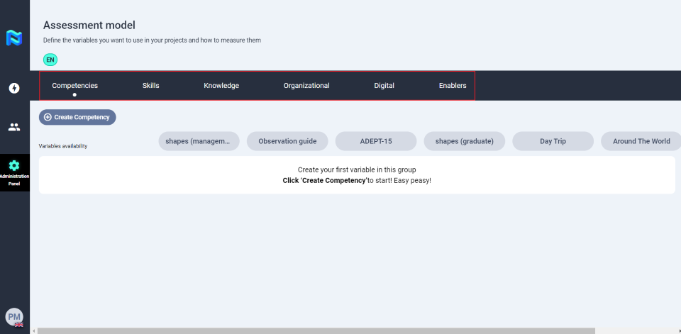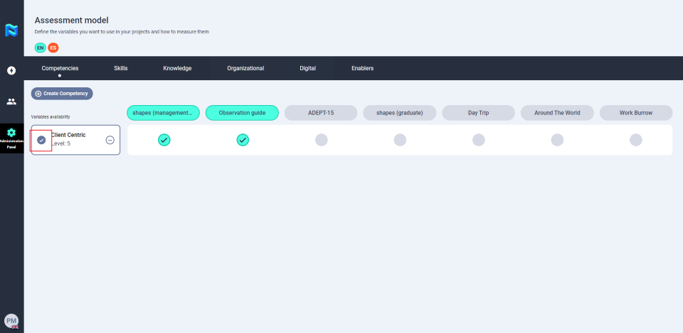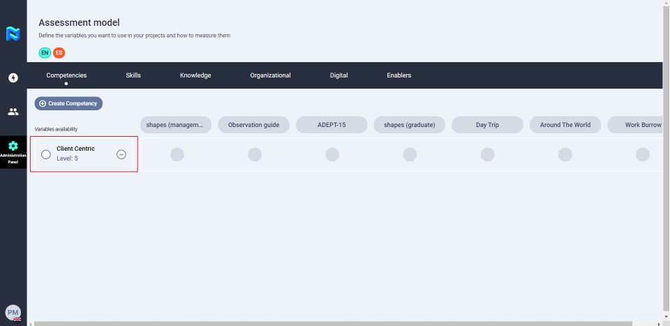 Remember to mark the competency so that it appears in the list of project variables. To mark it, click on the circle to the left of the variable name.