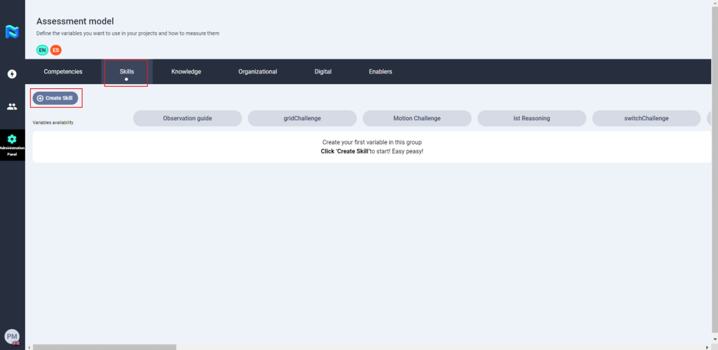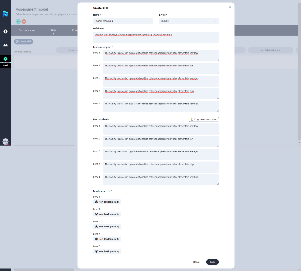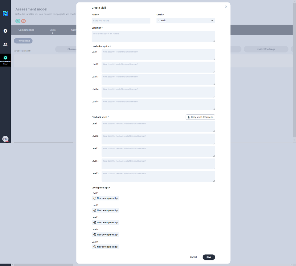 Note that the level of the skills has to match the level defined in the project so that they appear in the list of the available variables of the project you are going to define.
