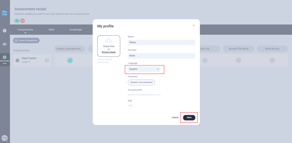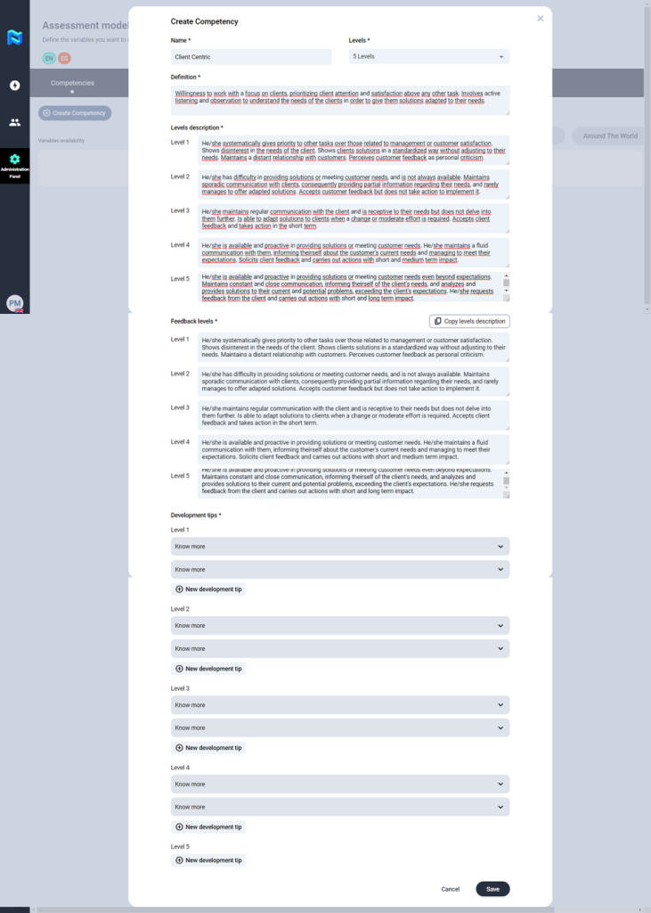 Then, you will have to complete all the fields needed to define that competency, those fields marked with a * are mandatory. Finally, click on “save”.