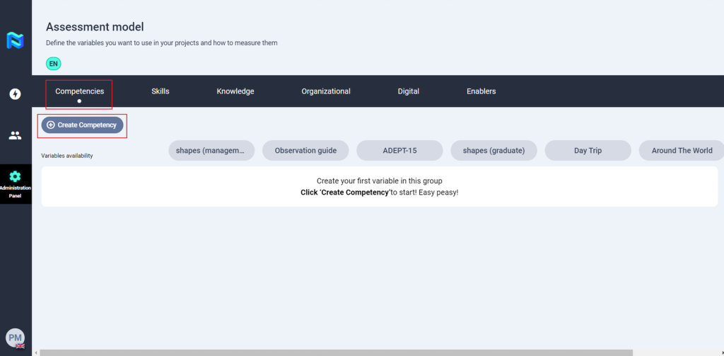 To add a new competency to the model, you will need to go to the competencies section and click on the “Create Competency” button.