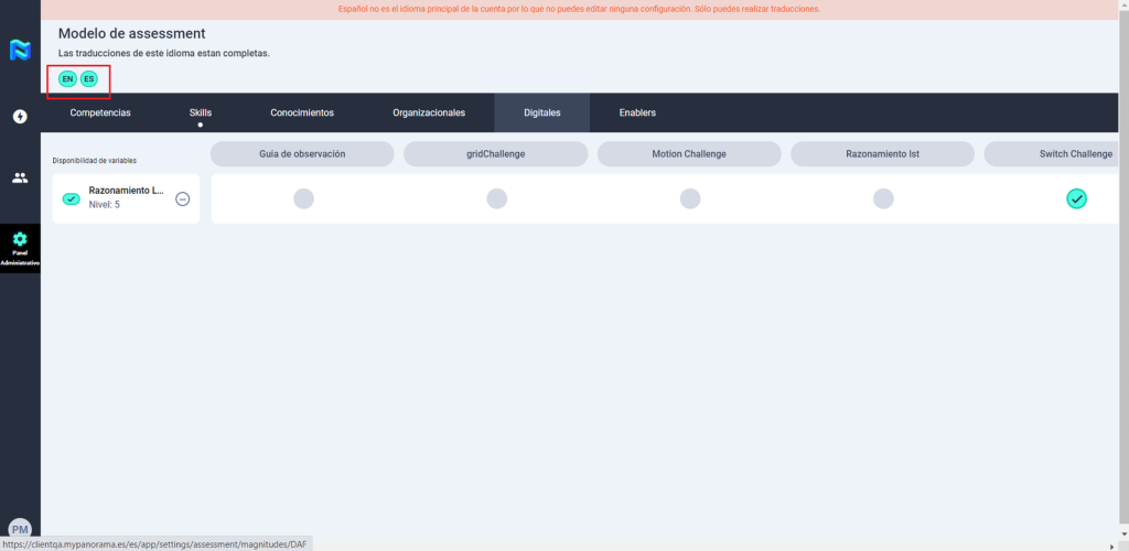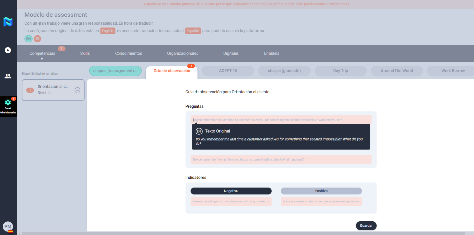 If the client is configured in multiple languages, you will need to translate all the variables created into all the languages that the project has. The platform will indicate in orange those languages that are missing for translation. In the case of the example, you will see that the Spanish translations are missing.