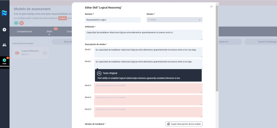 To add the new language select the variable or tool and complete the fields that need to be translated. As an orientation, you will have available in a modal the original text of each section that you need to translate.