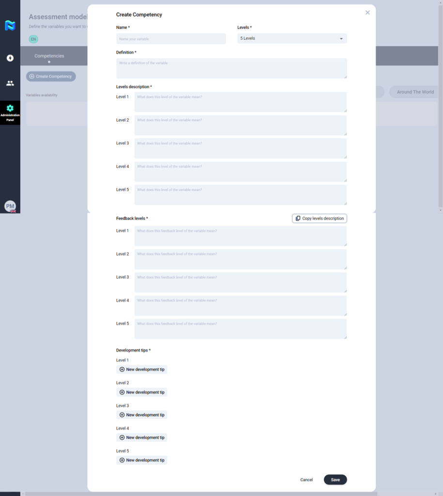 Note that the level of the competencies has to match the level defined in the project so that they appear in the list of the available variables of the project you are going to define.