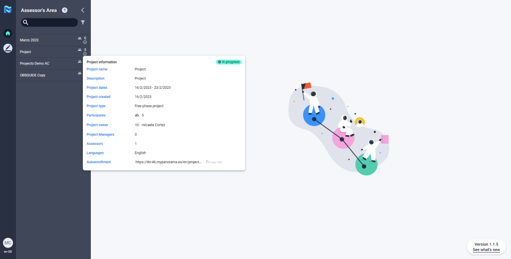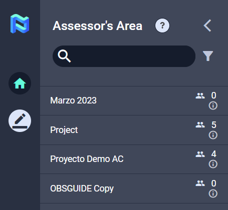 When you access the assessor area, in the sidebar you will find the list of projects in which you have a participant assigned to be assessed. To access a specific project, click on the project name. Also, in the right of each project name, you will see the number of participants you have assigned.