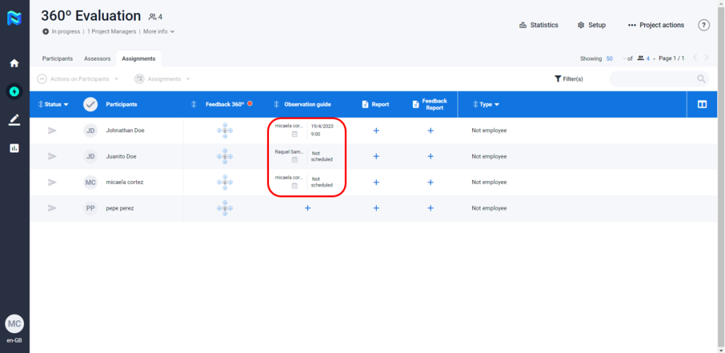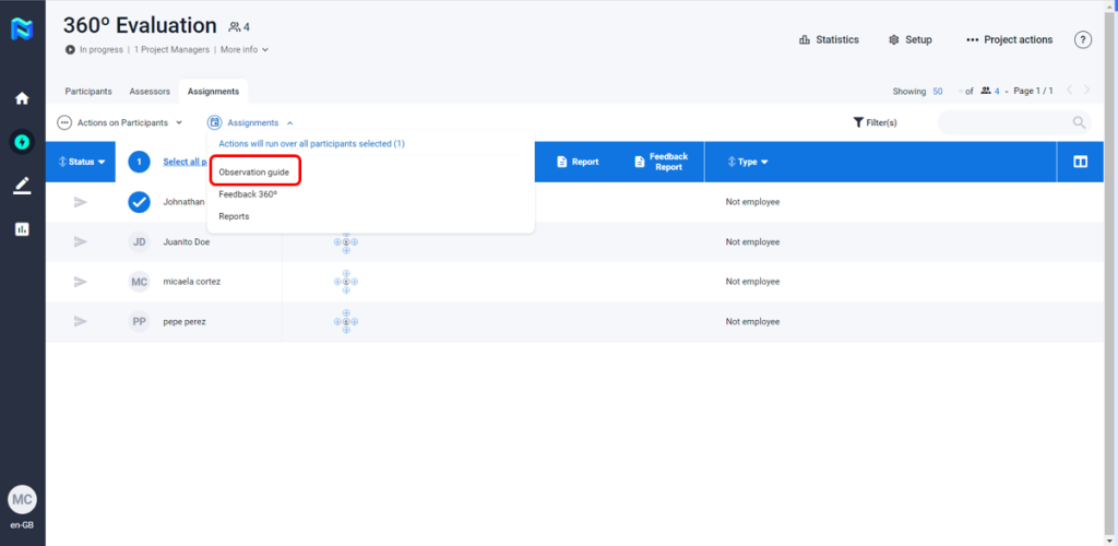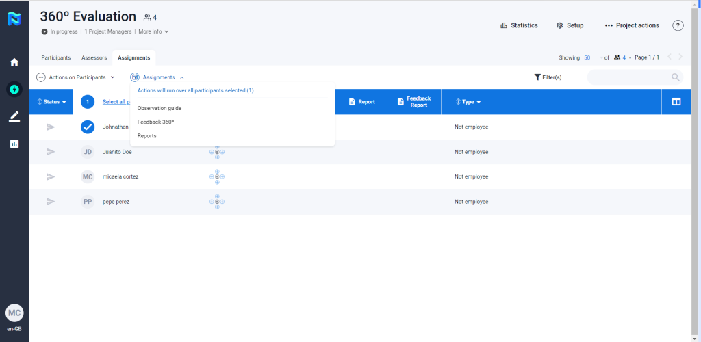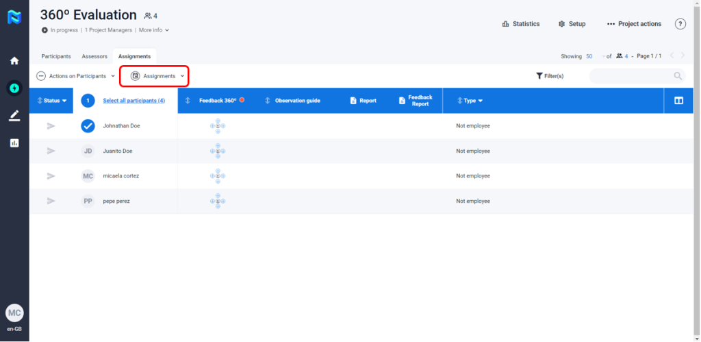 To assign assessors to participants the Project Manager must be placed in the “Assignments” tab and select the participant(s) to enable the “assignments” option.