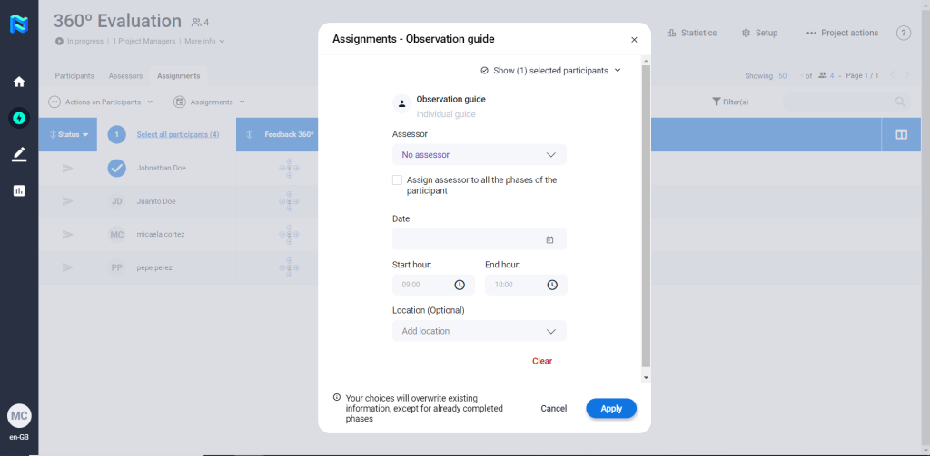 After you fill the information you click on apply and the assessor would be assigned to the participant(s).