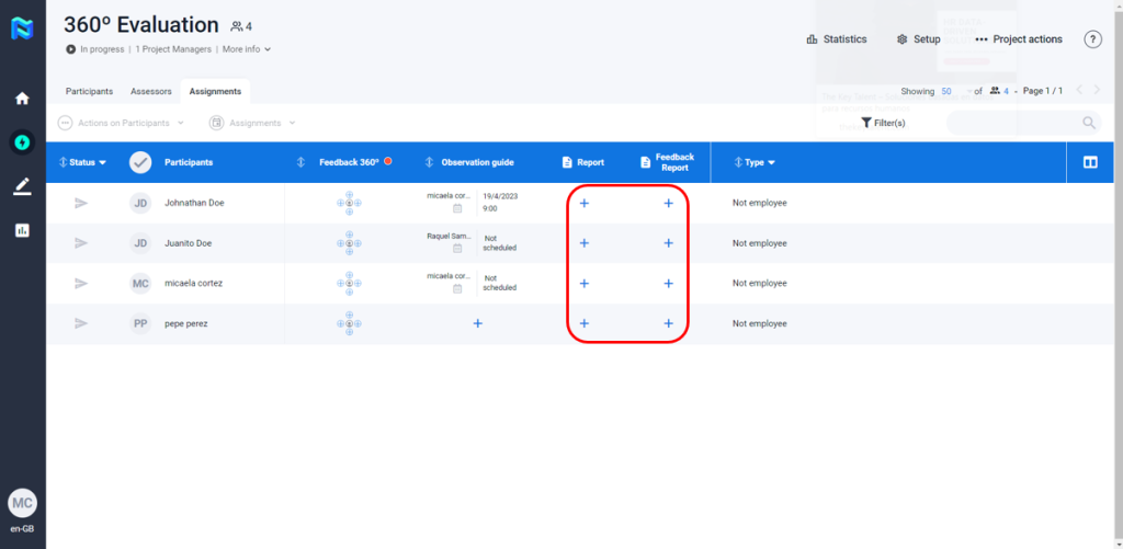 To assign assessors to participants the Project Manager must be placed in the “Assignments” tab and click on the (+) icon.