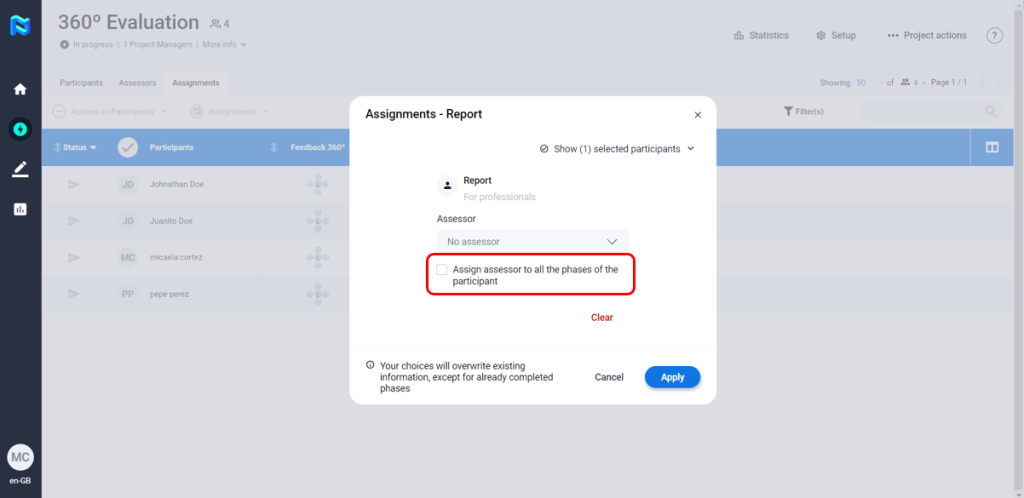 Once done that, it will appear a pop, where you will be able to select the assessor. Additionally, you will have the option to selecet if you want to assign that assessor to all the phases of the participant.