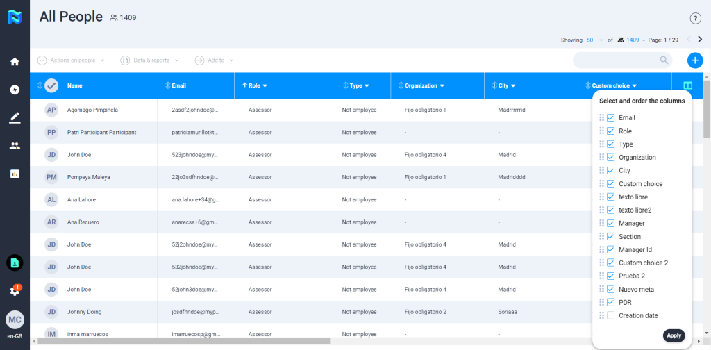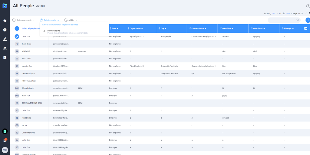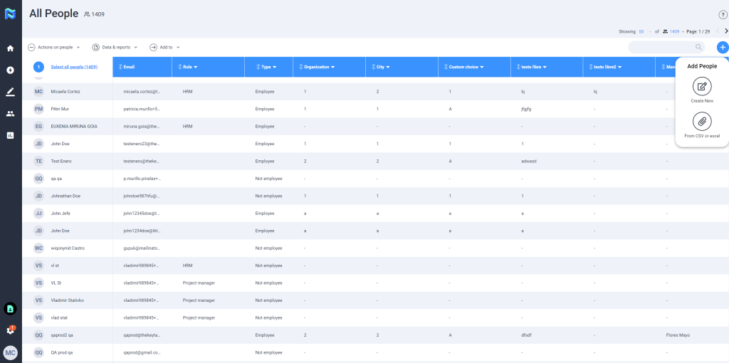 You can manage people by selecting a person, and clicking on “Actions on people”. That way you can send a communication, edit information, invite to videocall and delete from the platform.