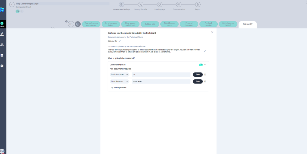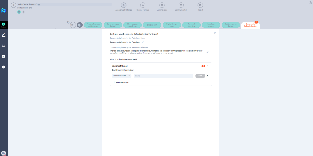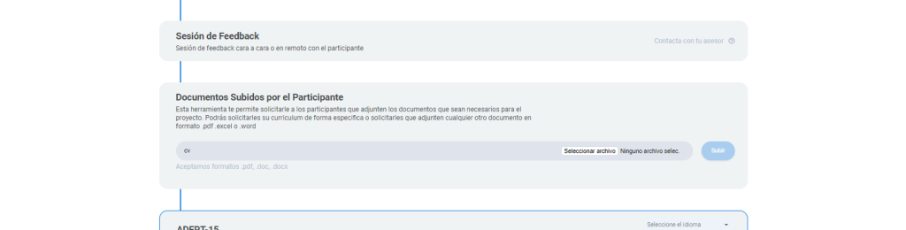 This tool allows you to ask participants to attach documents that are necessary for the project. You can ask them for their curriculum or ask them to attach any other document in .pdf .excel or .word format.