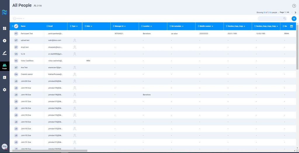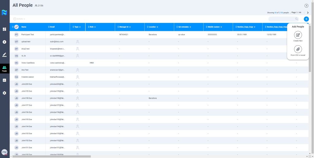 Desde aquí podrás añadir personas haciendo clic en «+«. Puedes hacerlo desde el CSV oCreando uno nuevo. Podrás encontrar más información sobre esto en «Añadir participantes»