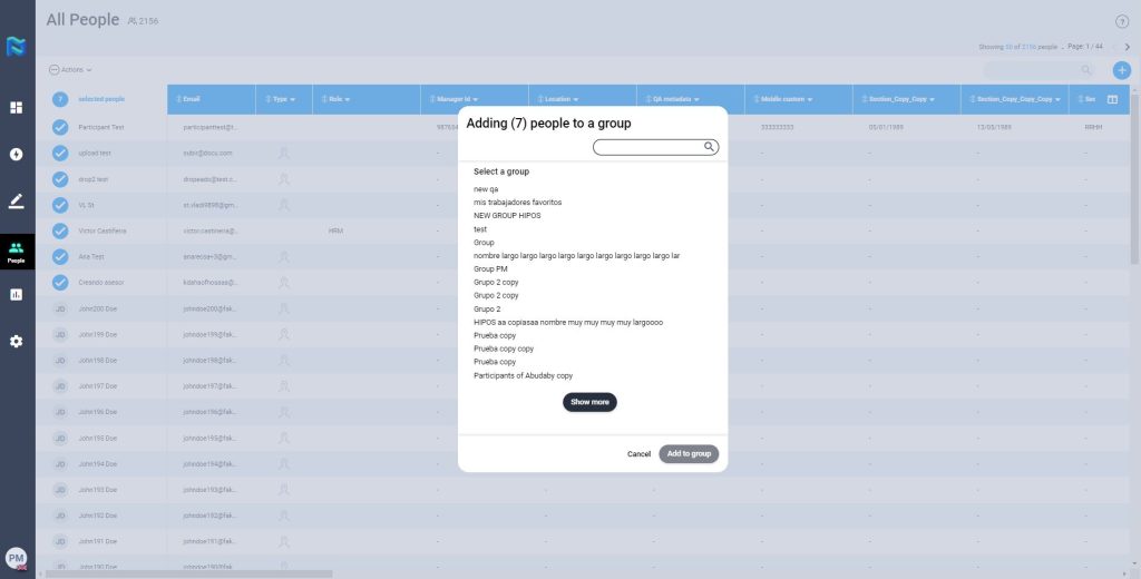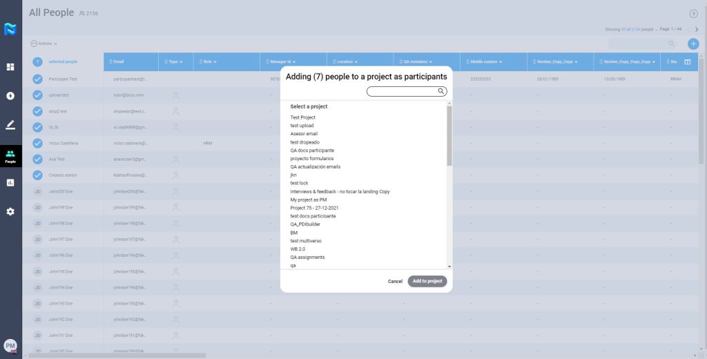 Al hacer clic en «Añadir al proyecto» o «Añadir a grupo» verás un menú desplegable con los proyectos o grupos disponibles a los que puedes añadir personas. Selecciona el que quieras y haz clic en el botón correspondiente para añadir a las personas seleccionadas previamente.