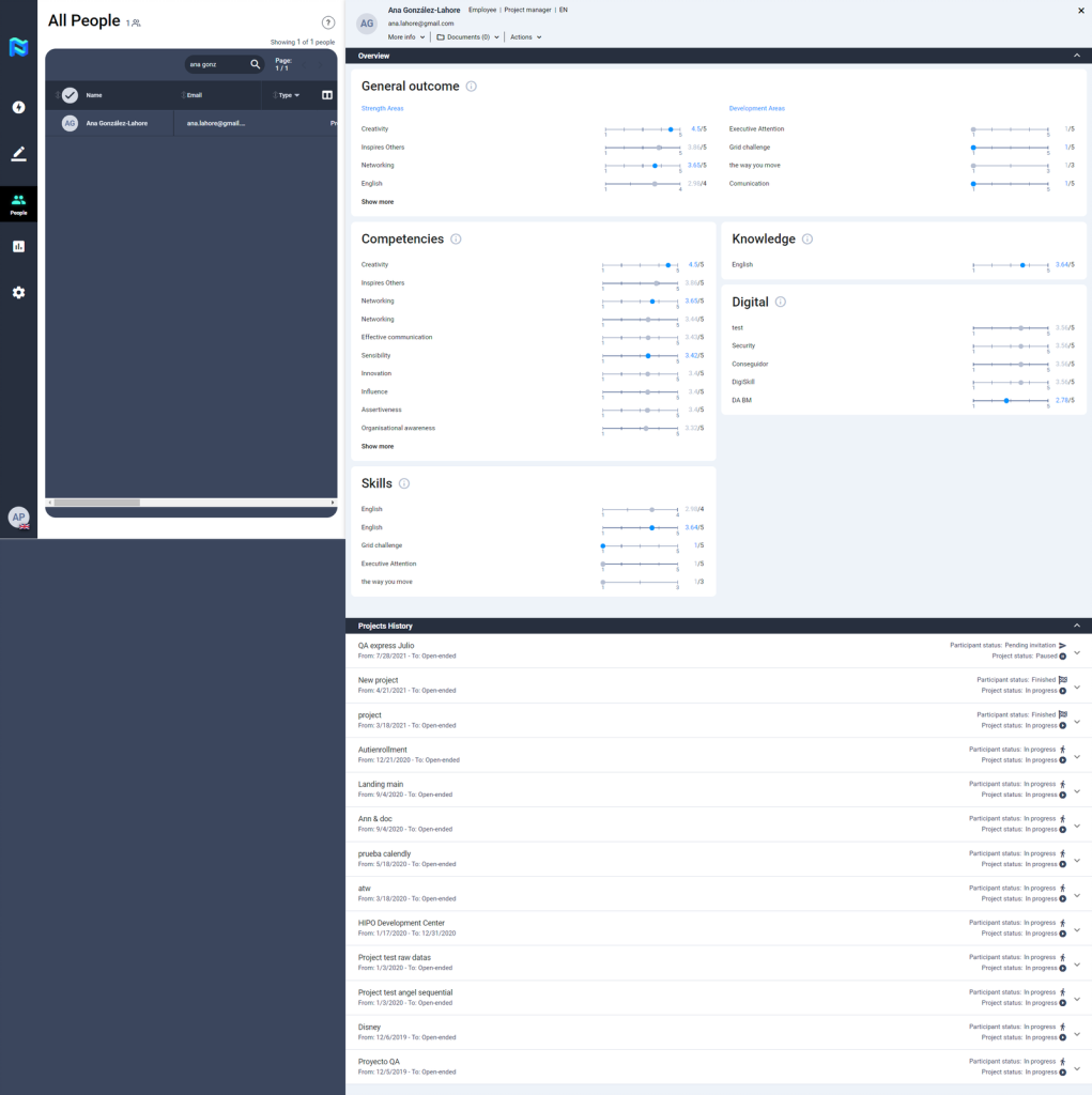 Cuando hagas clic en un participante, se abrirá a la derecha unresumen de los detalles del mismo. Podrás ver un informe sobre las competencias evaluadas y el historial de proyectos del participante.