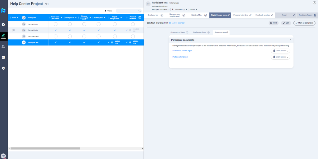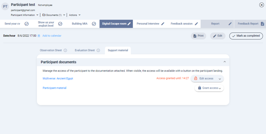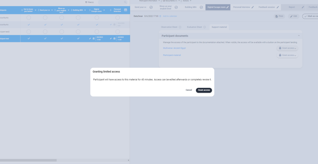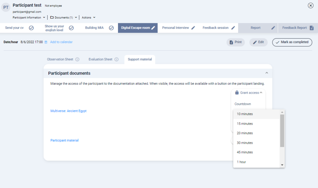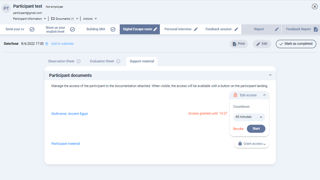 Go to the “support material” and manage the access of the participant to the document attached. When visible, the access will be available with a button on the participant landing. Select how long you want the participant to have access to the document and click on “start” and then “grant access“.