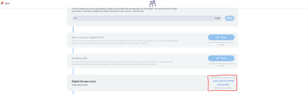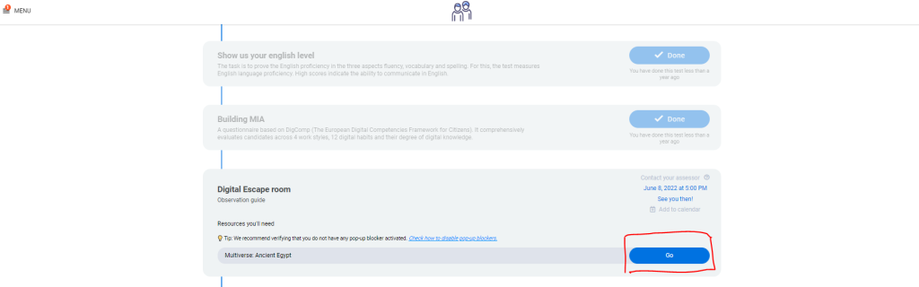 This is how the participant sees the landing page before giving access to the documentation needed to carry out the exercise and below the same image but after giving access to the documentation.