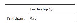 Leadership = ((sociable *0,333) + (conscientious * 0,666)) *1,2= ((-1*0,333) + (1*0,666)) * 1,2 = 0,76