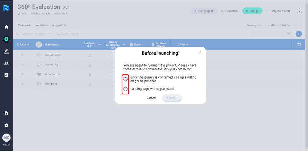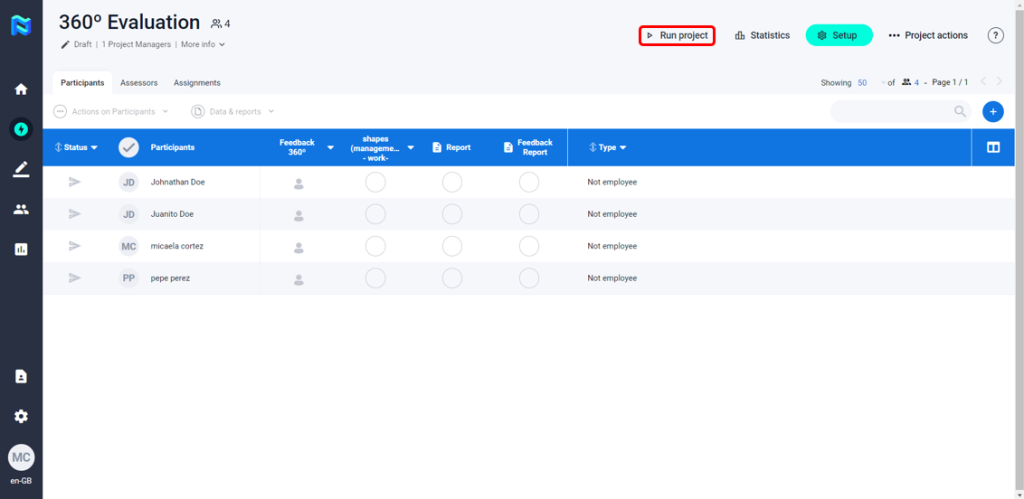 Once we have set up the Project and added the participants and assessors, you can launch the Project. To do so, all you have to do is to press the “Run project” button and check the suggested points. At this point the Project will be shown as “in progress” and no further changes can be made to the basic configuration (you can still add participants and assessors and make assignments).