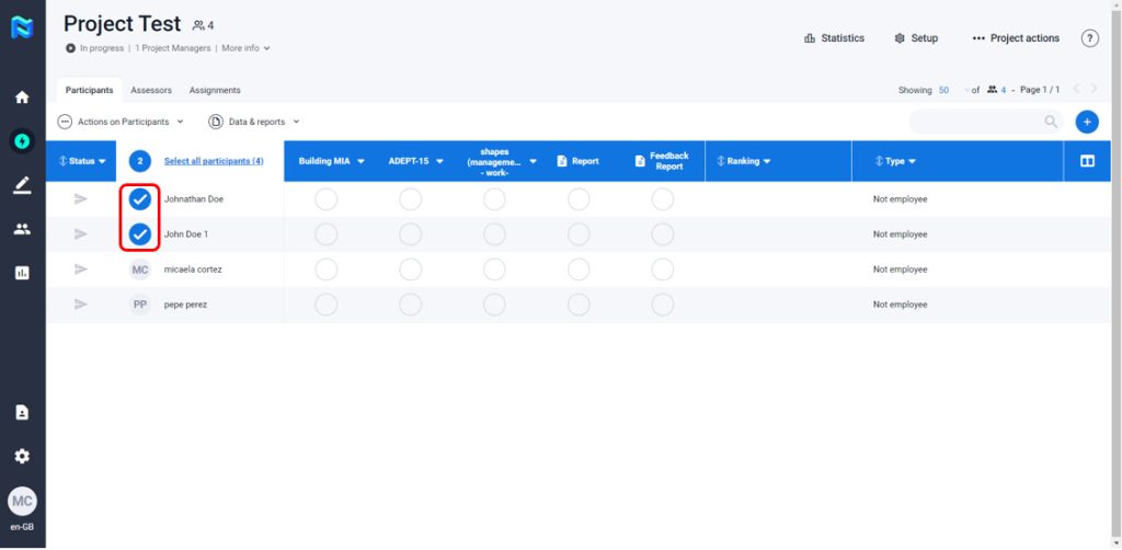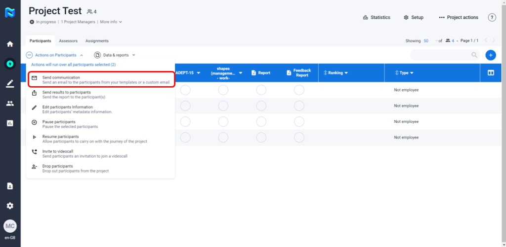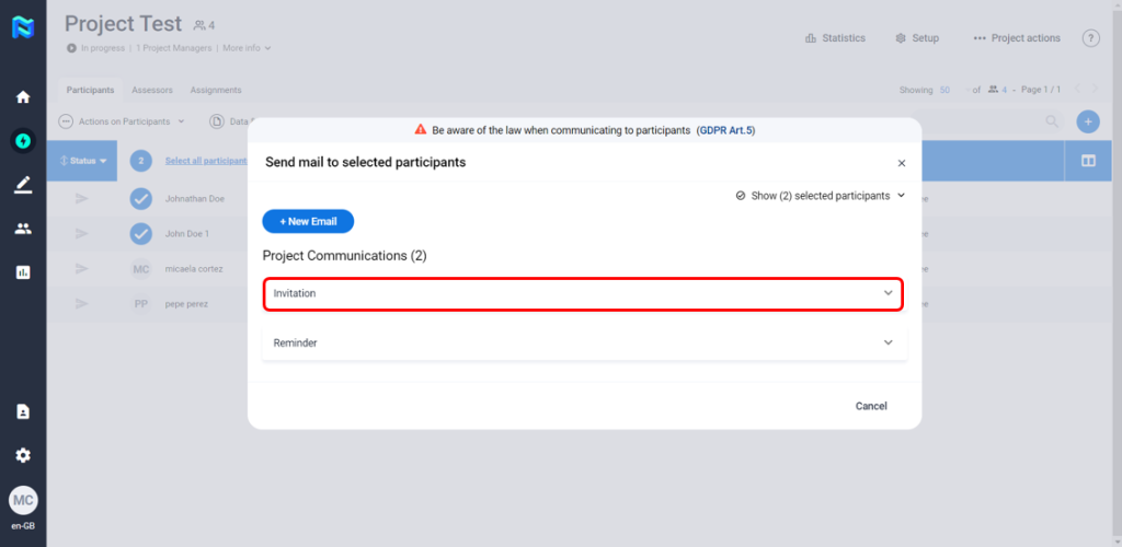 For the project to start, you must send the invitations to the participants manually (if we have not previously left the self-invitation tick active in the communications). To do this, we select the participants we want to invite to the project at this time, press the “Actions” button, select the “Send Communication” option, select the “Invitation” option and click on the “Send” button,  at this time the selected participants will receive an e-mail with access to their “landing page”.