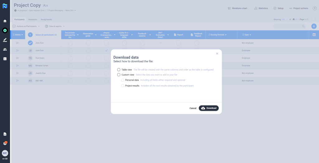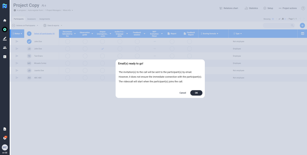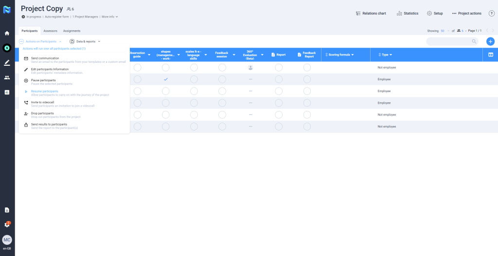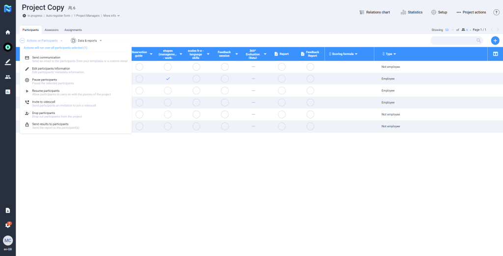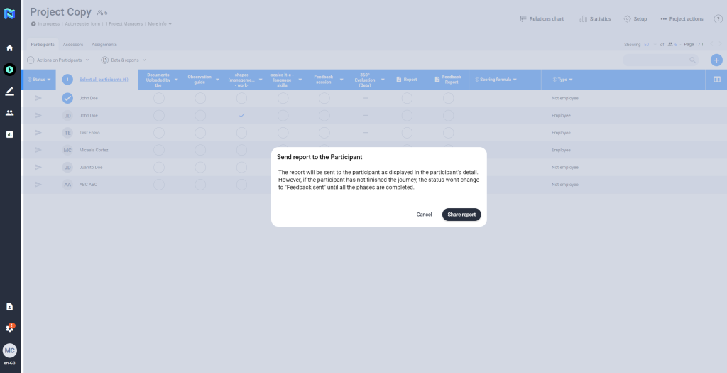 The platform allows the possibility of sharing the Feedback Report directly with the participants. To perform this action, the participant does not need to have finished the project journey. This is activated by pressing the ”Actions” button, and selecting the option “Send results to participants”, you then press the button “Share report”, at this time the participant will receive an email indicating that he/she can consult the results of the project on the web that will redirect the link obtained in the mail.