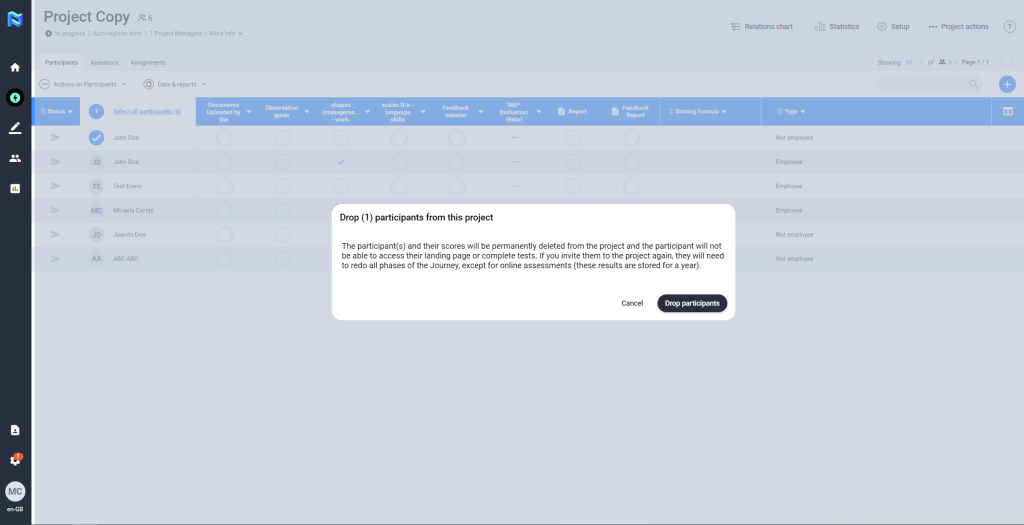 This action is done by marking the participant in the icon to the left of his/her name and clicking on the “Actions” button, we select the option “Drop participants”.​​​​​​​ The participant(s) will be deleted from the project permanently. Even so, you will have all their results in the People section.