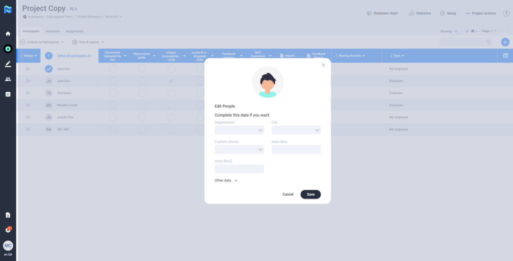 You will be able to edit the participant’s metadata, as well as the language. This action is done by marking the participant in the icon to the left of his/her name and clicking on the “Actions” button, we then select the option “Edit participant information”. Then, you will have to save the data by clicking on the “save” button.