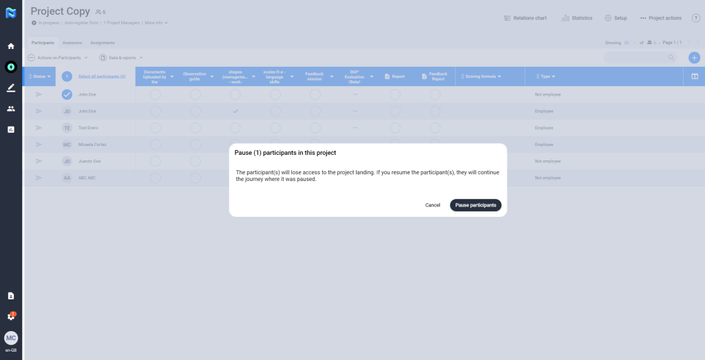 Panorama allows the PM to pause a participant in a given project when it’s required, making it impossible for him/her to advance to the next phase of the project. This action is done by marking the participant in the icon to the left of his/her name and clicking on the “Actions” button, we then select the option “Pause participants”.​​​​​​​ The participant(s) will lose access to the project landing. If you resume the participant(s), they will continue the journey where it was paused.