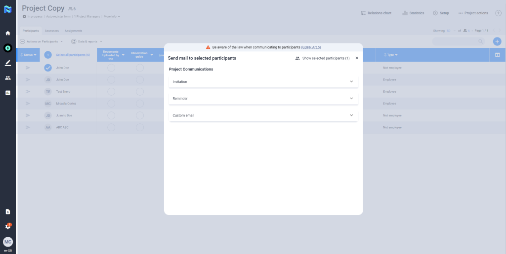Custom e-mail: This e-mail is used to send any type of communication to the participant about the project they are part of.