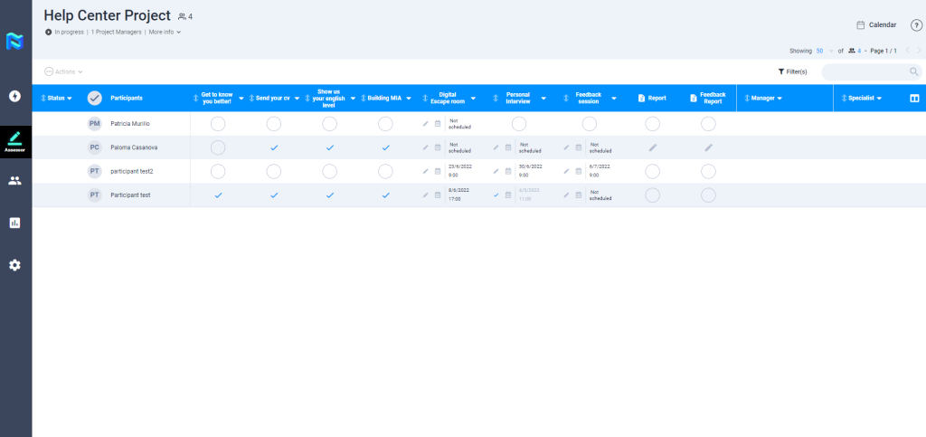 When you access the assessor area, you will find the participant’s table with the participants to whom you have been assigned to one of the phases