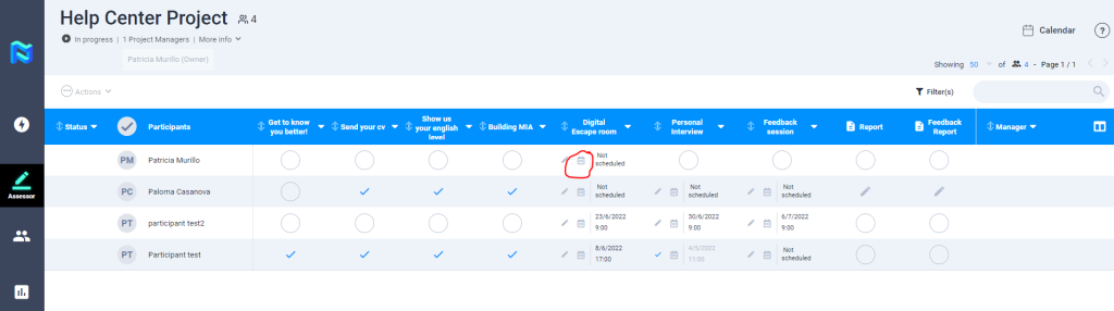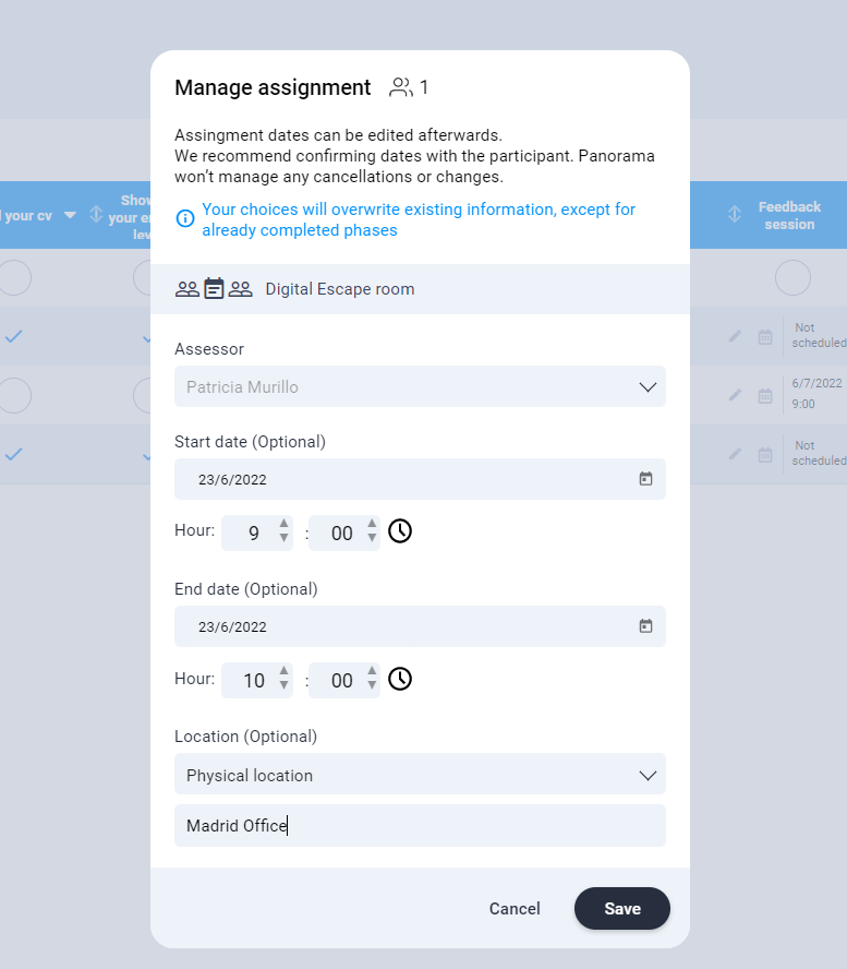 - Manage assignment: As an assessor, you can assign a date, time and location when the appointment with the participant will take place. Assign dates can be edited afterwards. We recommend confirming dates with the participant since Panorama won’t manage any cancellations or changes. To assign/edit the date, time or location click on the icon represented as a “calendar” and add the date, time and location you wish to assign to that participant. The participant will see this information on his/her landing page, and will receive an email whenever there are any changes.