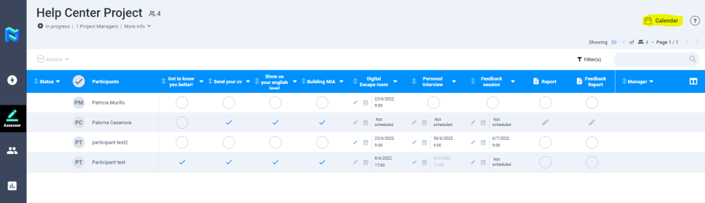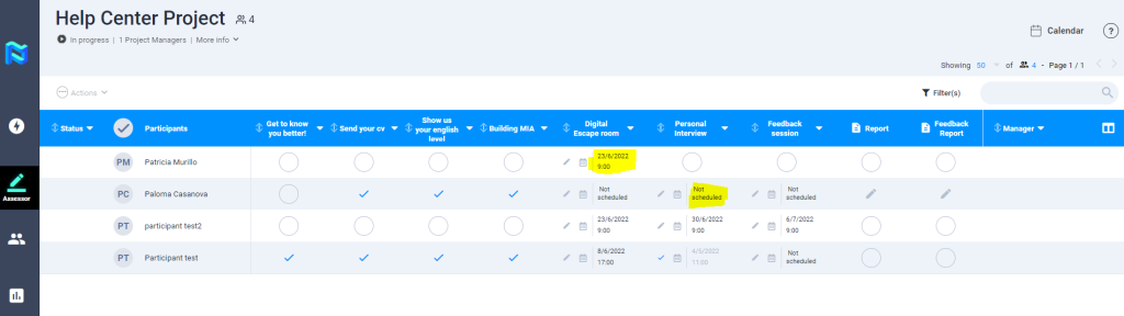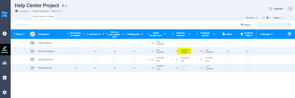 When a participant has been booked through Calendar, it will be represented in the table with the text “Booked on calendar“. The assessor can manually enter the date and time chosen by the participant, so that it is reflected in the table and in the participant’s landing.