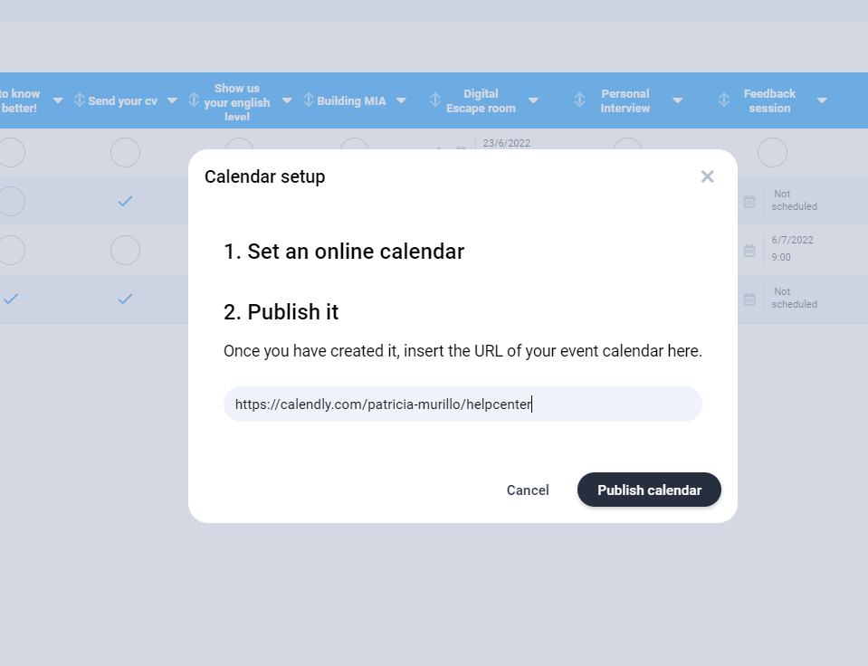 - Assign by calendar: Panorama also allows you the option of adding your calendar so that participants can schedule themselves according to your availability. To do this, click on the “Calendar” button at the top right of the screen. You must set a online calendar, and once you have created it, insert the URL of your event calendar there. Then, click on “Publish calendar“. Note: This will send emails to every participant, so they can book their assessments in your calendar. We recommend you not to publish it until you have all of your slots set.