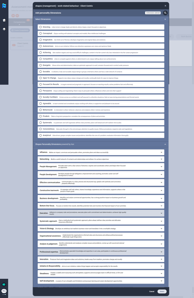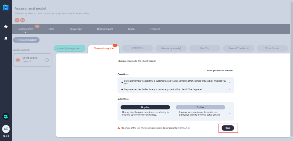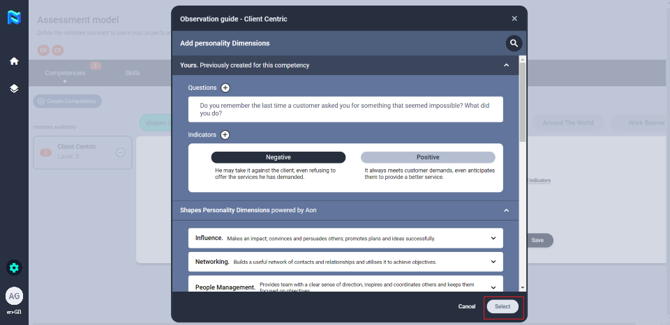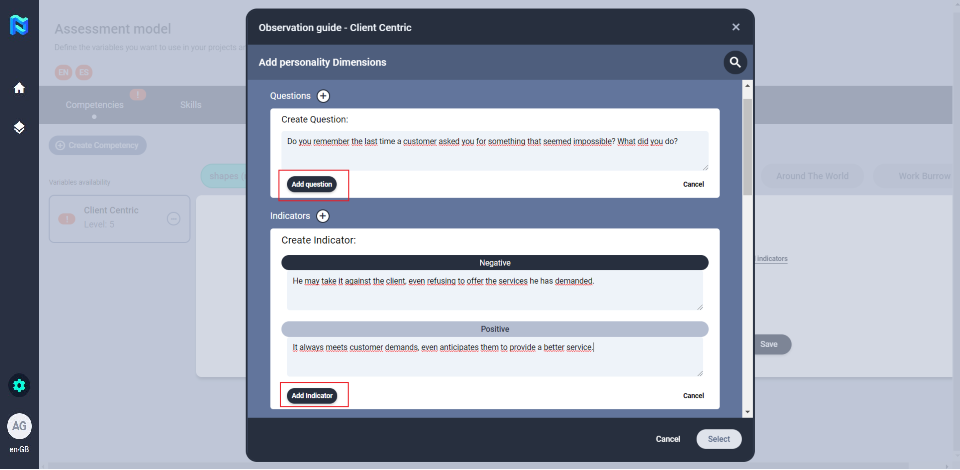 You can create your own questions and indicators or you can use the questions and indicators that are preloaded on the platform that corresponds to the shapes competency model.