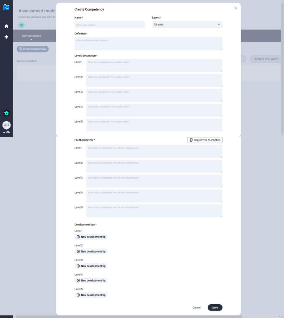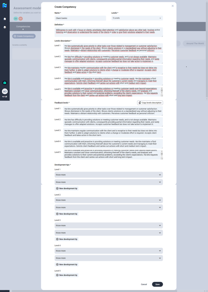 Then, you will have to complete all the fields needed to define that competency, those fields marked with a * are mandatory. Finally, click on “save”.