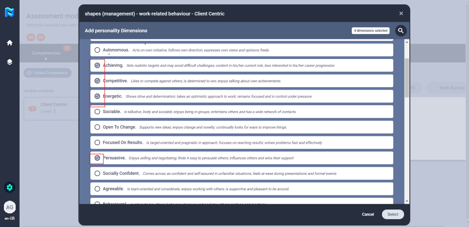 To do this, click on the competency and then mark the circle corresponding to the tool with which you want to measure it. When you do this, you will see that the tool will automatically be marked orange and an exclamation mark will appear on it, this means that the tool needs to be configured for the selected variables. Then, click on the tool to configure it.