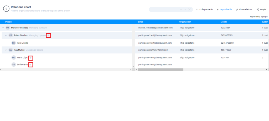 When you access the organisational chart you will be able to see the organisational relationships of the participants in the Project.