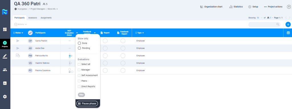 - 360º Evaluation – We have added a filter in the participant’s table for the 360º evaluation tool that allows filtering by status type (done and pending) for each evaluating group, which allows the PM to manage the project much more efficiently.