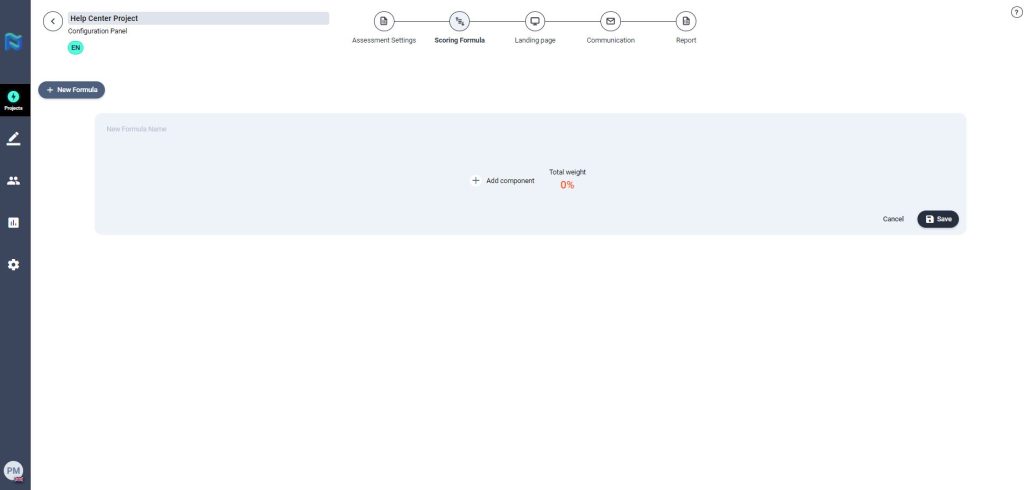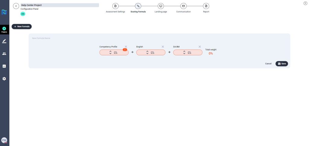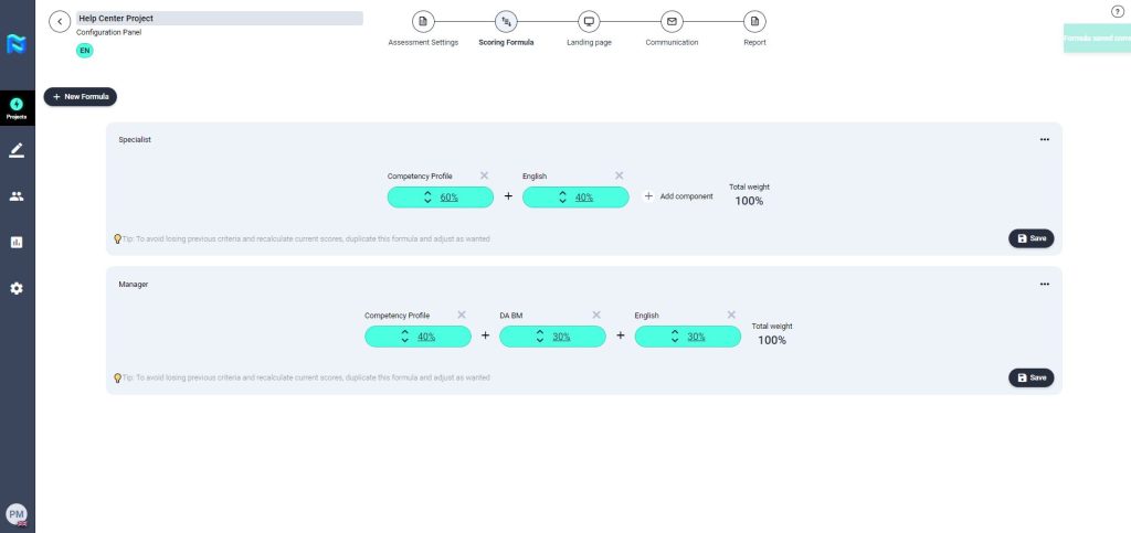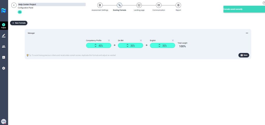 Remember that to save an evaluation formula it must have a name, otherwise, the formula will not be saved in the project. Additionally, you must ensure that the variables in the formula add up to 100% or the project will not save.
