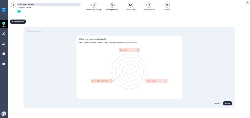 In this step of the project, you will create all those formulas (Reference profile) with which you want to measure and evaluate the project you are creating, choosing to do so, which variables you want to weigh, and what percentage.